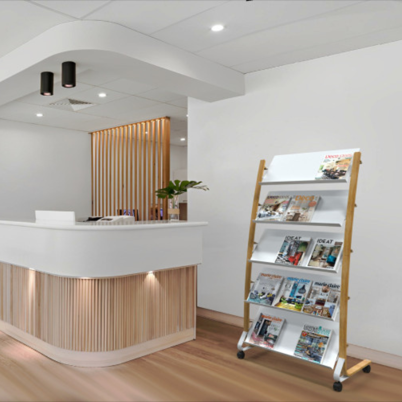 - Mobiilsel ajakirjahoidjal on 15 sektsiooni (5 × 3), valmistatud valgest ABS-materjalist.