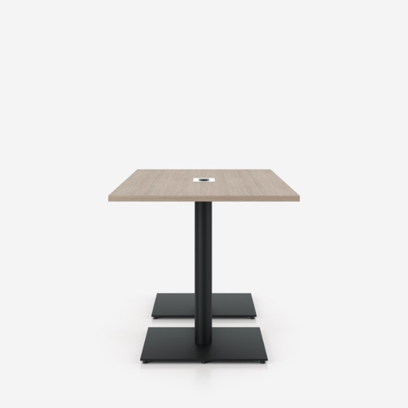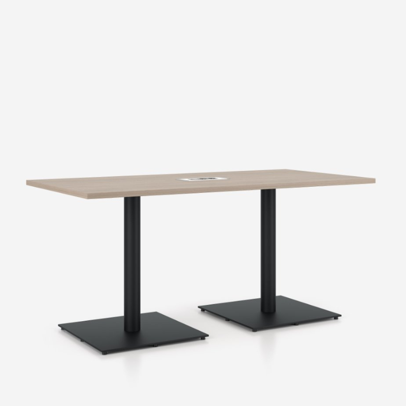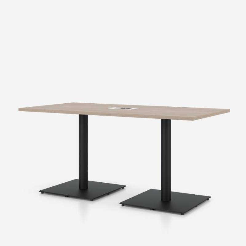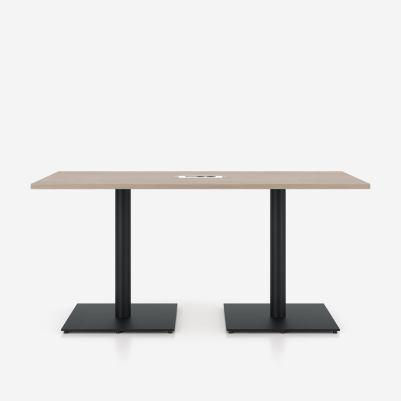 Sirgete joonte ja lihtsa vormiga koosolekulaud, millel on hele puidutoonis ristkülikukujuline töötasapind. Mustad metalljalad ja stabiilsed kandilised alused tagavad vastupidavuse ja tugeva toe. Laua keskel asub kaabeljuhtimise lahendus, mis hoiab tööpinna korras ning sobib ideaalselt professionaalsesse koosolekuruumi.