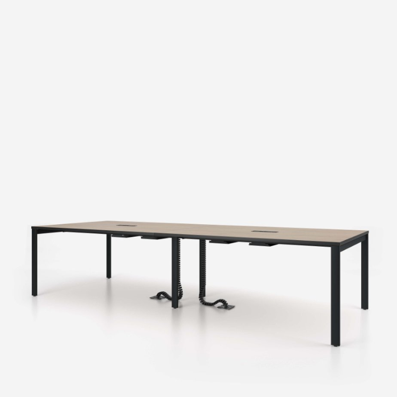Pikk ja massiivne ristkülikukujuline koosolekulaud, millel on tume puidutoonis töötasapind ja must metallraam. Laua integreeritud kaabeljuhtimise süsteem hoiab juhtmed organiseerituna ja tööpinna korras. Minimalistlik disain ja vastupidav konstruktsioon muudavad selle ideaalseks suurematele koosolekutele ja meeskonnatöö aladele.