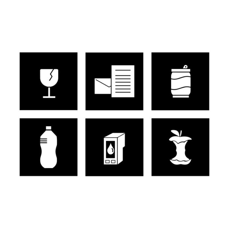 Komplektis 6 sorteerimiskleepsu (paber, plast, metall, klaas, biojäätmed, tindikassetid)