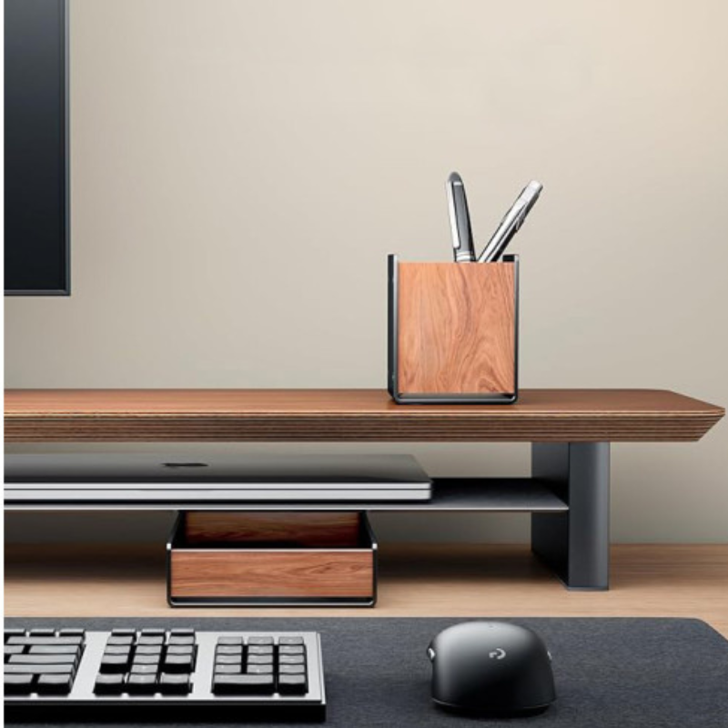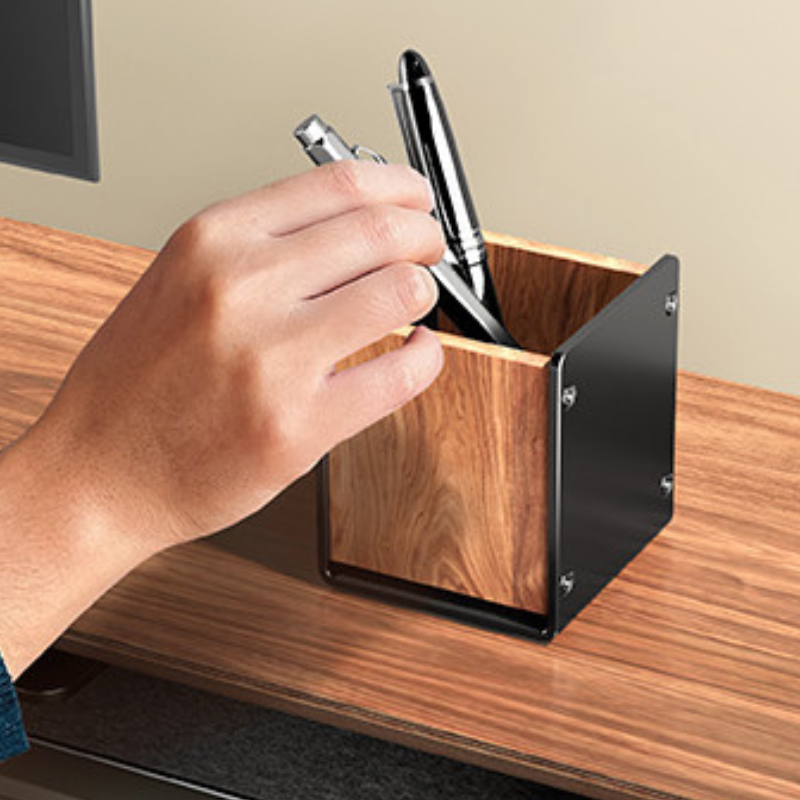 Optimeeri oma tööpinda selle puidust ja metallist pliiatsitopsiga, mis on mõeldud pastakate, pliiatsite ja muude vajalike töövahendite hoidmiseks. Kompaktne ja elegantne disain tagab korrastatud ja puhta töökoha ning lisab lauale sooja aktsendi. Minimalistlik vorm ja kvaliteetsed materjalid ühendavad vastupidavuse ja stiili, muutes selle asendamatuks lauatarvikuks. Praktiline ja esteetiline valik kaasaegsesse ning ideaalselt organiseeritud kontorisse.